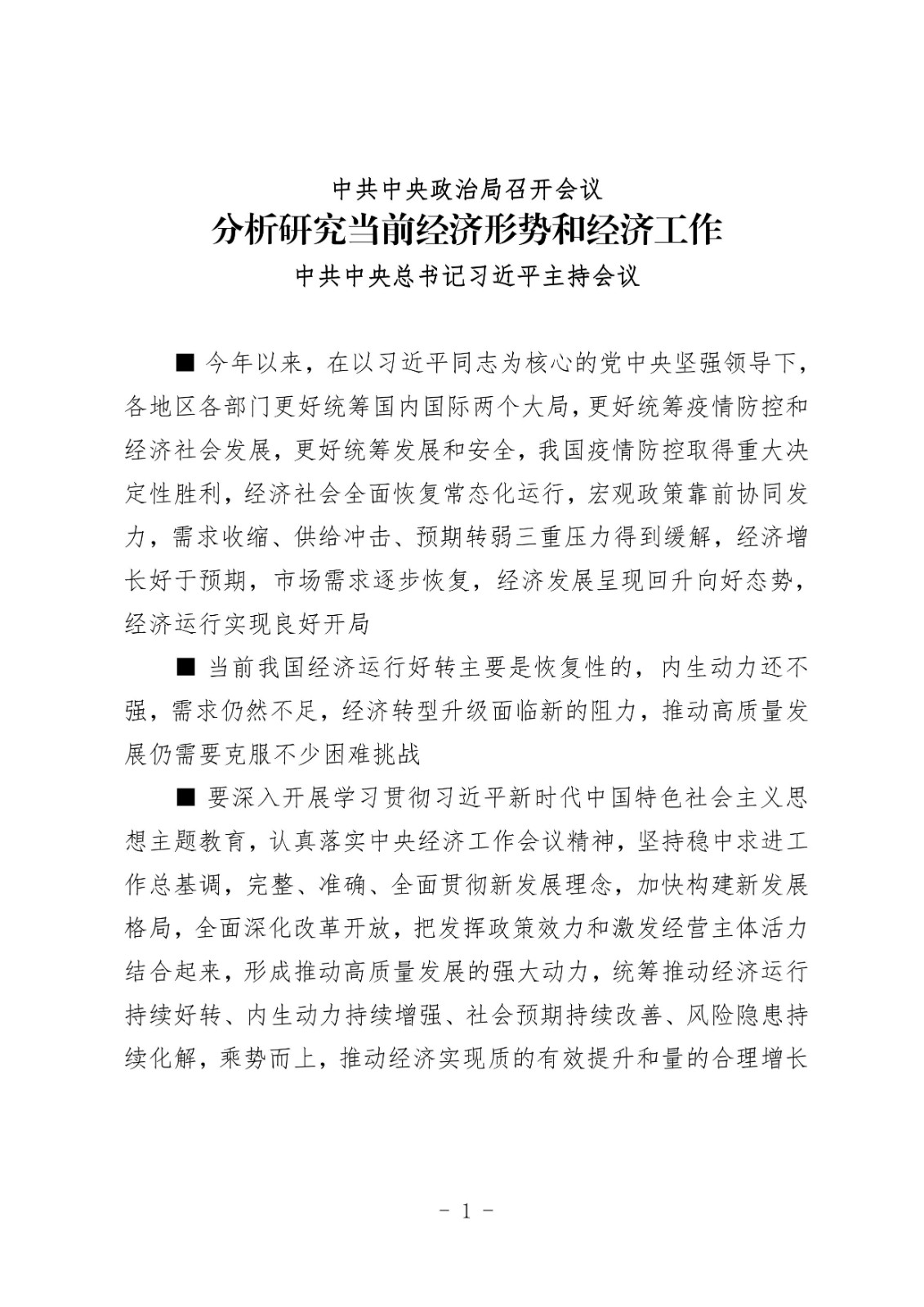 中共中央政治局召開會議分析研究當前經濟形勢和經濟工作