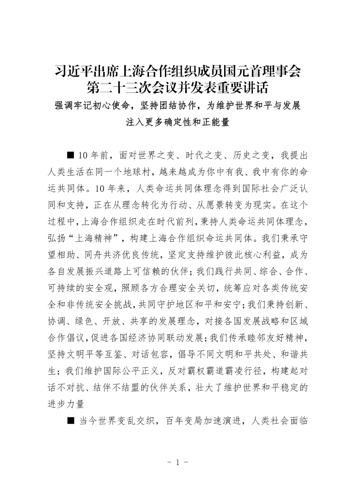 習近平出席上海合作組織成員國元首理事會第二十三次會議并發(fā)表重要講話